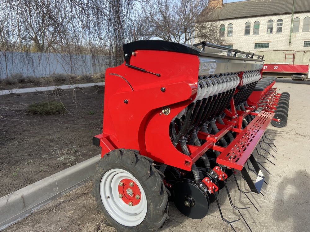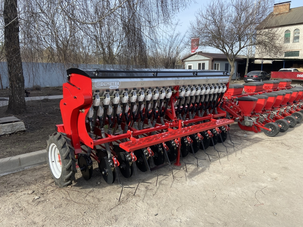 Сеялка зернотуковая "ДЕМЕТРА МИНИ" 1500V, c бесступенчатой коробкой передач(вариатор), предназначена для рядового посева зерновых культур (пшеницы, ячменя, ржи, овса), зернобобовых (соя, горох, фасоль, нут, чечевица, бобы), мелкосемянных культур (рапс, горчица, лен) сыпучих и средне сыпучих семян трав с одновременным внесением минеральных удобрений.